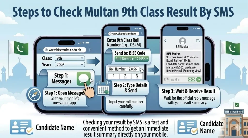 Send your roll number to the official Multan Board SMS code and wait for the reply.