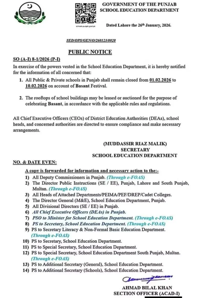 The Punjab Education Department has not announced any Basant-related holidays. Education Minister Rana Sikandar Hayat has also made no statement confirming school closures.